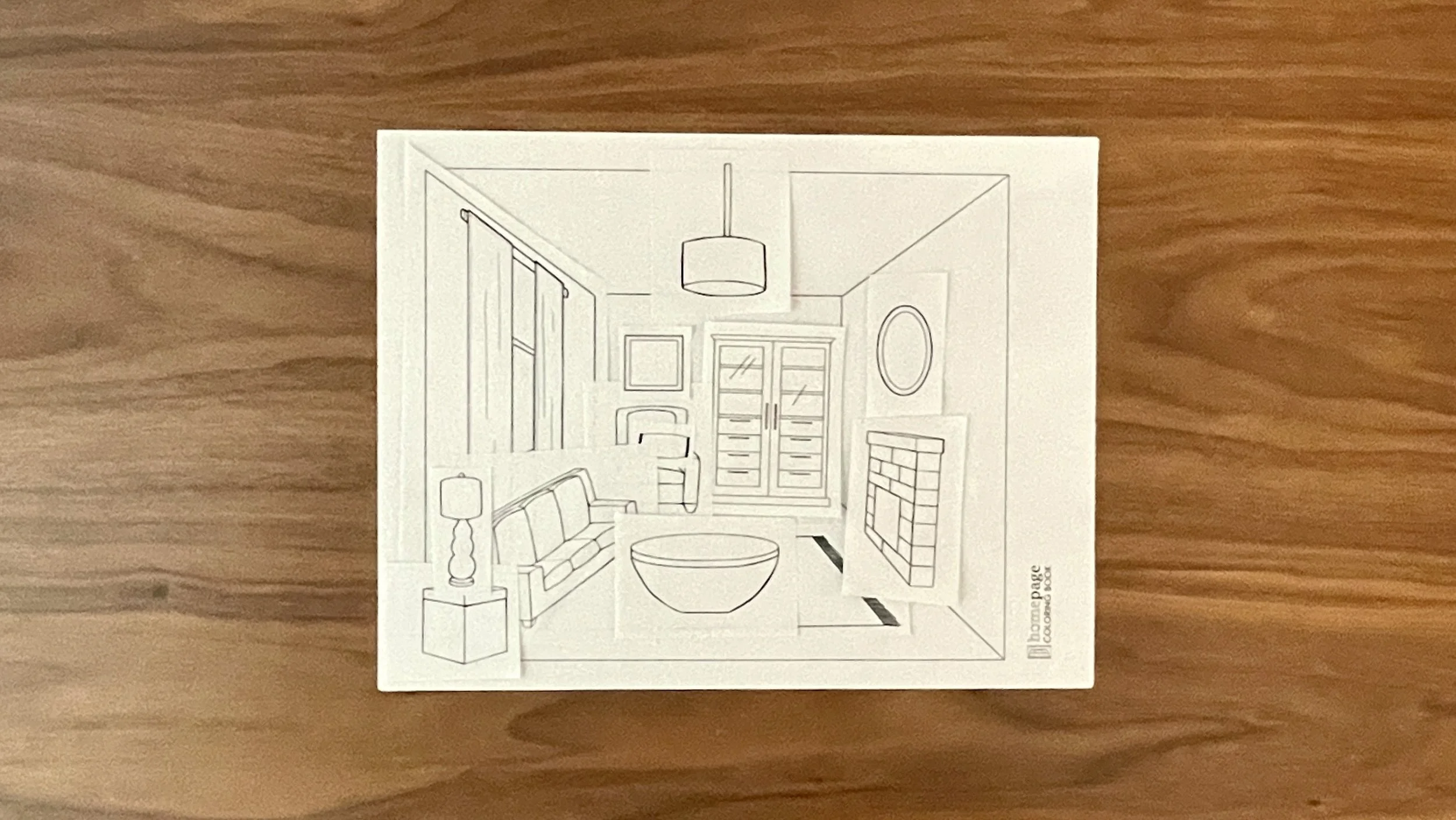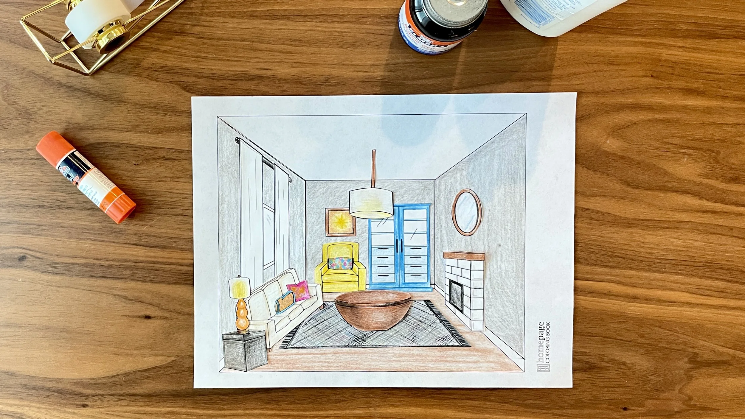 Then, color the items you selected. Start with area rugs, fireplaces, and windows. Shelving and artwork are next, and then youโll work through your furniture selections. End with pillows, lamps, and lighting.